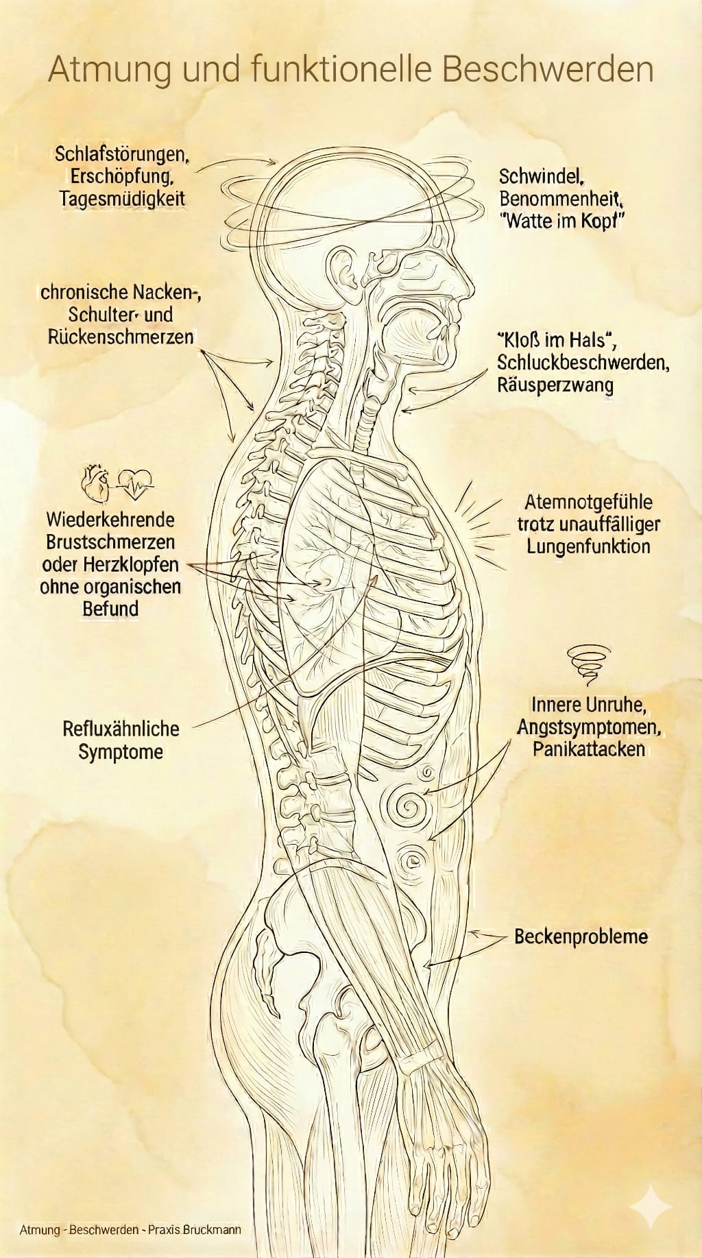 Atmung: Funktionelle Beschwerden - Praxis Bruckmann 2026Wir zeigen, wie man funktionelle Atemstörungen erkennt und welche Behandlungsmöglichkeiten es gibt, z. B. durch gezieltes Atemtraining und manuelle Therapie (u. a. Pohltherapie®). Wie hängen Atmung, Muskel‑ und Faszienspannung, Nervensystem und Stress zusammen – und warum verstärkt „falsches“ Atmen viele Beschwerden wie Nacken‑, Rücken‑, Brustschmerzen, Erschöpfung oder sogar Angstgefühle.