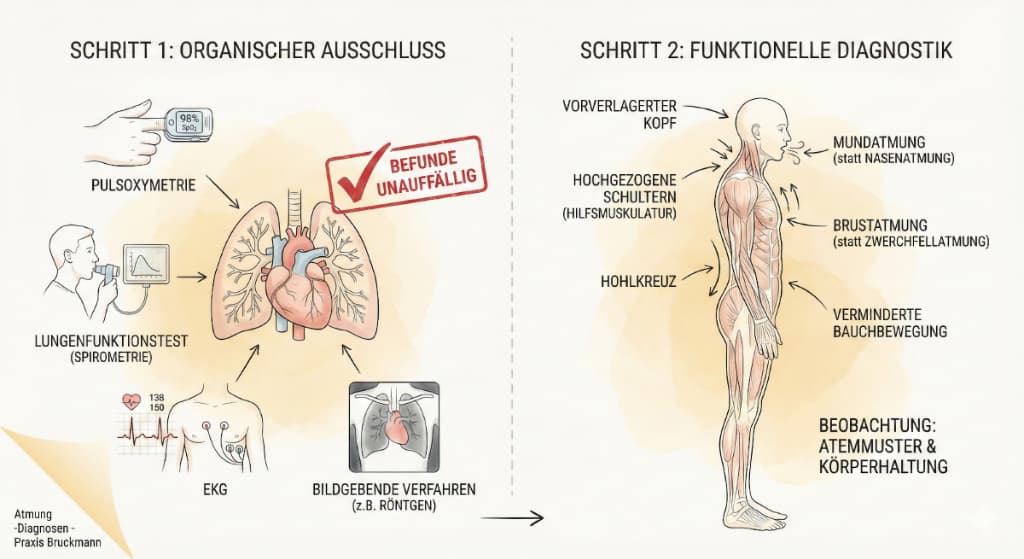 Atmungsstörungen erkennen - Diagnoseschritte - Praxis Bruckmann (2026)Zunächst müssen organische Erkrankungen (z. B. Herz‑ oder Lungenerkrankungen) ärztlich ausgeschlossen werden, etwa durch Pulsoxymetrie, Lungenfunktionstest, EKG und ggf. bildgebende Verfahren. Bleiben diese Befunde unauffällig, rückt das Atemmuster in den Fokus.