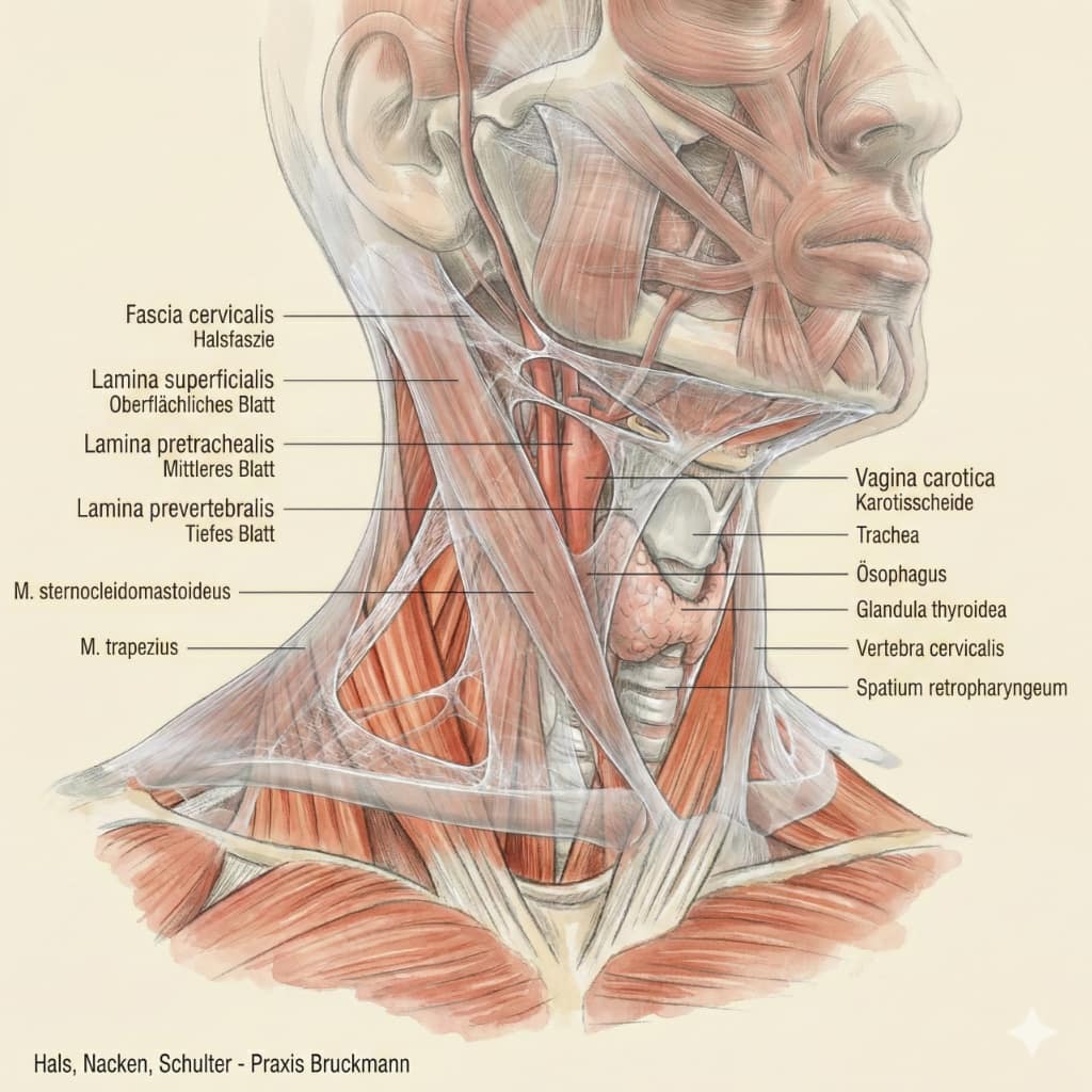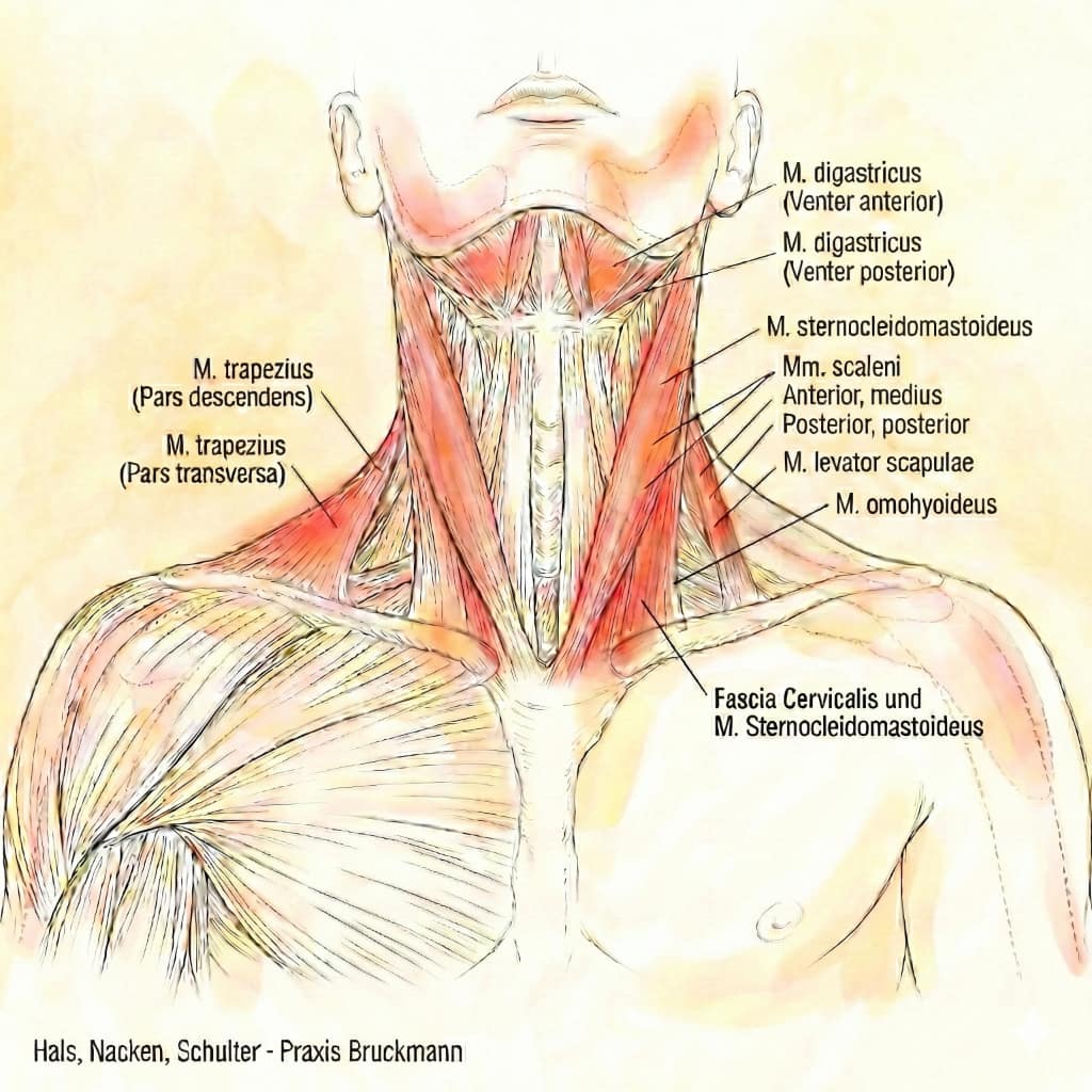 Kloß im Hals und andere Beschwerden (Nacken, Kiefer, Hals) - Praxis Bruckmann (2026)Das Gefühl "Kloß im Hals" kann sehr belasten, ebenso Schluckbeschwerden sowie Halsschmerzen ohne Befund. Halsbeschwerden machen allein 2,7% der Beratungsanlässe in deutschen Hausarztpraxen aus (DEGAM, 2021, S. 26). Das ist auch Teil eines sehr breiten und für Hausarztpraxen nicht unproblematischen Leistungsspektrums (Laug, 2010, S. 15). "Obwohl bakterielle Ursachen bei Halsschmerzen eher selten sind, werden bei über 60 % der Halsschmerzpatienten Antibiotika verschrieben" (DEGAM, 2021, S. 10). Aber nicht nur die diagnostische Unterscheidung zwischen bakteriellen und viralen Ursachen ist problematisch. Wenn die Beschwerden chronisch werden, können sie die Lebensqualität stark einschränken. Längst nicht alle Beschwerden sind ausschließlich organisch bedingt (z. B. Reflux, Schilddrüse, bei Struma ...), sondern können durch Verspannungen und Überlastungen entstehen. In der Medizin bezeichnet man anhaltende Schmerzen, die durch Verspannungen und Überlastung bedingt sind, auch als Myofasziales Schmerzsyndrom (vgl. Shah, 2008 und Treaster, 2006). Die myofaszialen Auswirkungen auf das "Kloßgefühl" stehen in der Forschung noch am Anfang, werden aber zunehmend beachtet und registriert (vgl. Bordoni, 2019; Bordoni, 2017; Patel, 2020; Schabrun, 2018).
