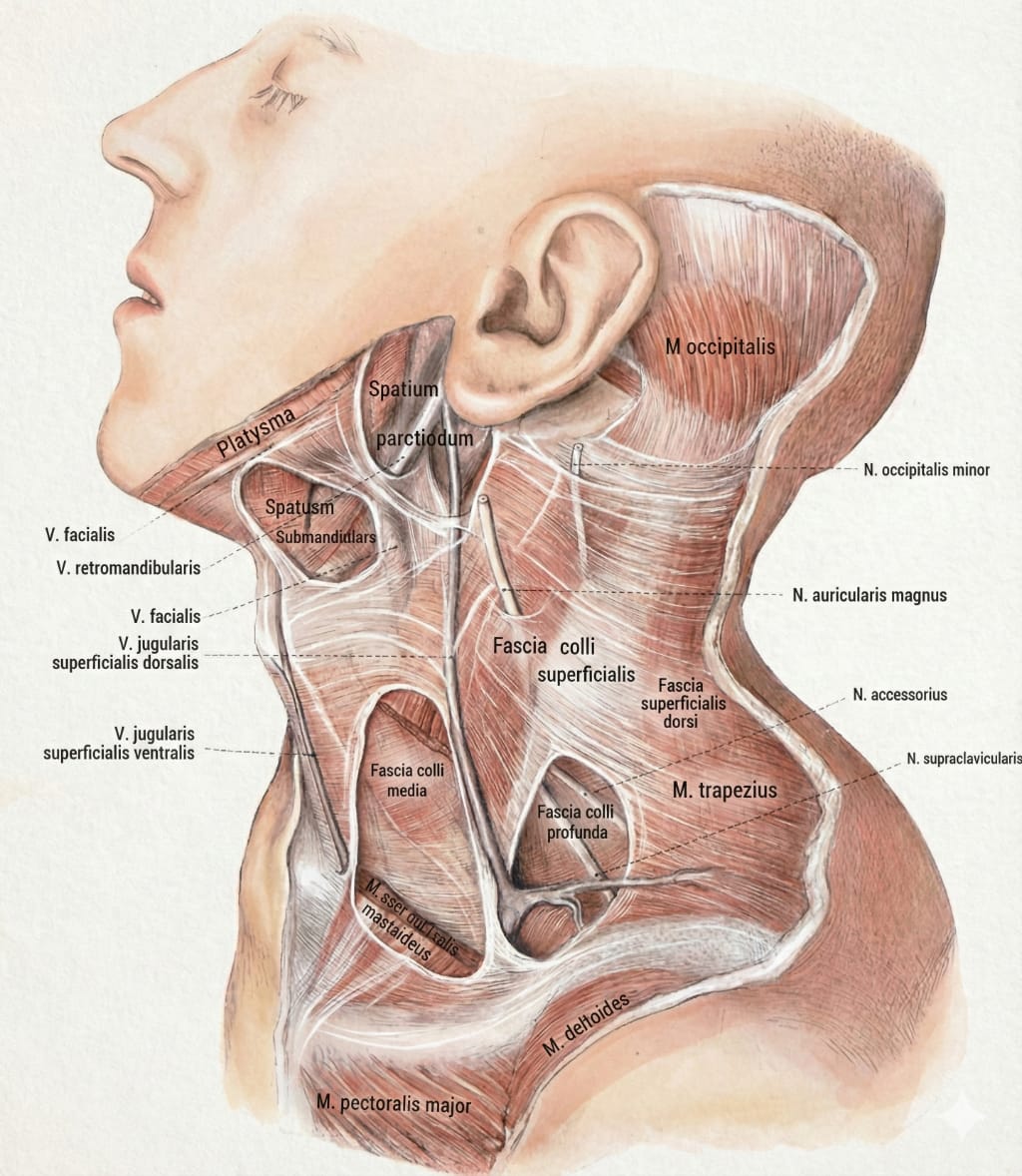 Hals mit Binde, Rauber-Kopsch, 1940Schon 1940 zeichneten Rauber-Kopsch in Ihrem Anatomiebuch Binde (Faszien ) und Muskeln deutlich ein (siehe oberes nachkoloriertes, nachgezeichnetes und überarbeitetes Bild). Was diese noch nicht wissen konnten, das diese "Binde" eine komplexe biochemische Struktur eines Zugspannungsnetzwerkes darstellt und viele funktionale nervale Zusammenhänge und Wechselwirkung veursachen bzw. darauf reagieren kann. Stellen Sie sich anhand der Zeichnungen vor: Dass Bindegewebe (Faszien) wird ein wenig dicker, oder es wird weniger elastisch. Stellen Sie sich dann noch vor, die Muskeln, wie im Bild dargestellt, verkürzen oder verhärten sich. Was könnte das auslösen? Viele funktionelle Beschwerden können die Folge sein.