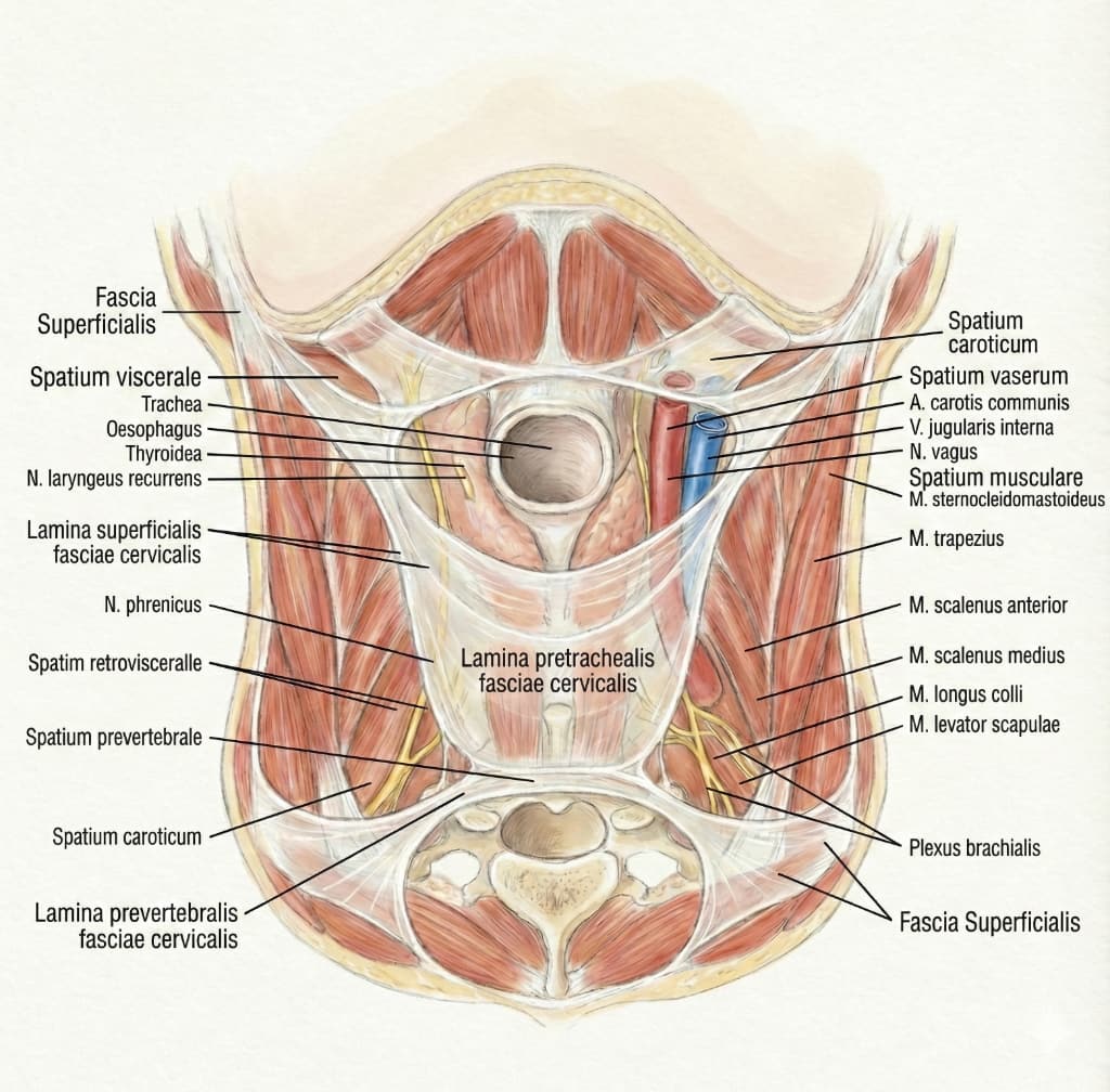 In jedem Fall von unerklärlichen Halsschmerzen, Globussyndrom, Stimmstörungen und Missempfindungen sollte differenzialdiagnostisch die Muskulatur mitsamt den Faszien des Halses als Verursacher von Beschwerden am Hals in Betracht gezogen werden (vgl. Bartolome, 2022). Neben der paralaryngealen Muskulatur kommen auch die Mm. Sternocleidomastoidei, das Platysma und sogar ein hypertoner Nacken als Verursacher in Frage. Manchmal tragen außerdem Fehlatmung wie Hochatmung oder verspannte Kiefermuskeln zu einer Überlastung der vorderen Halsmuskeln bei. Diese Beobachtung entspricht dem Konzept des Repetive strain injury (vgl. Lacerda, 2005), das in der Literatur beschrieben wird. „Wiederholte Belastungsverletzungen umfassen eine Gruppe von Störungen, die sich am häufigsten bei Arbeitnehmern mit übermäßigen und sich wiederholenden Bewegungen des Halses und der oberen Extremität entwickeln“ (Guidotti, 1992). Dabei übernehmen nämlich die kleinen Halsmuskeln Aufgaben der großen Atemmuskeln und sind dadurch überlastet. Deswegen ist in Regel die Atmung mitzubehandeln (vgl. Fleischer, 2017).