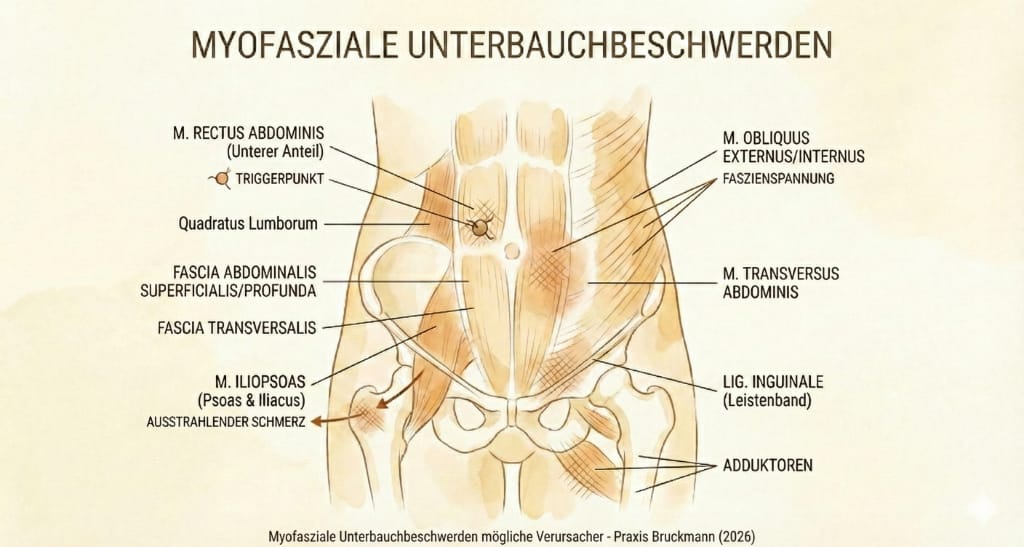 IIiiiImim,Im Unterbauch befinden sich zahlreiche oberflächliche und sehr tief liegende Muskeln. Durch Dauerspannung können auf diesen Muskeln Triggerpunkte entstehen. Dabei handelt es sich um einen druckschmerzhaften Punkt, an welchem sich verspannte und verhärtete Muskelfasern zusammenballen und Schmerzreize verursachen. Diese Reize können sich anfühlen wie Darmschmerzen, Blasenkrämpfe oder Nierenschmerzen sowie beispielsweise Eierstock- oder Gebärmutterkrämpfe. Tatsächlich sind diese Reize jedoch Muskelschmerzen!