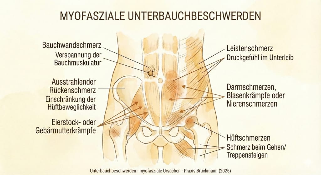 Oft sind Unterbauchschmerzen auf mehrere verspannte Muskeln zurückzuführen. Entstehen können diese unter anderem durch Schonhaltungen, welche wiederum weitere Verspannungen nach sich ziehen. Dort wo die Muskulatur steif und verspannt ist, sind außerdem meist Störungen im Bindegewebe der Unterhaut und der Faszien zu finden.