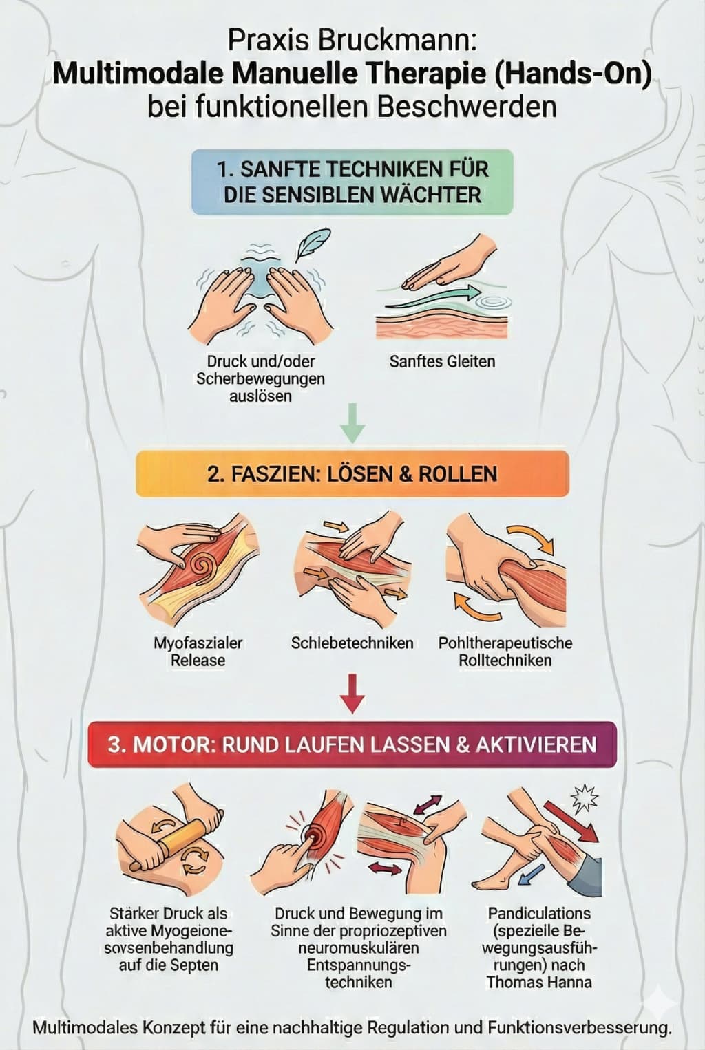 Zur positiven Beeinflussung funktioneller Beschwerden wenden wir in der Praxis Bruckmann multimodale manuelle Techniken an. Das bedeutet: Wir kombinieren verschiedene, aufeinander abgestimmte Handgriffe, um Gewebe, Nervensystem und Bewegung wieder besser ins Gleichgewicht zu bringen.