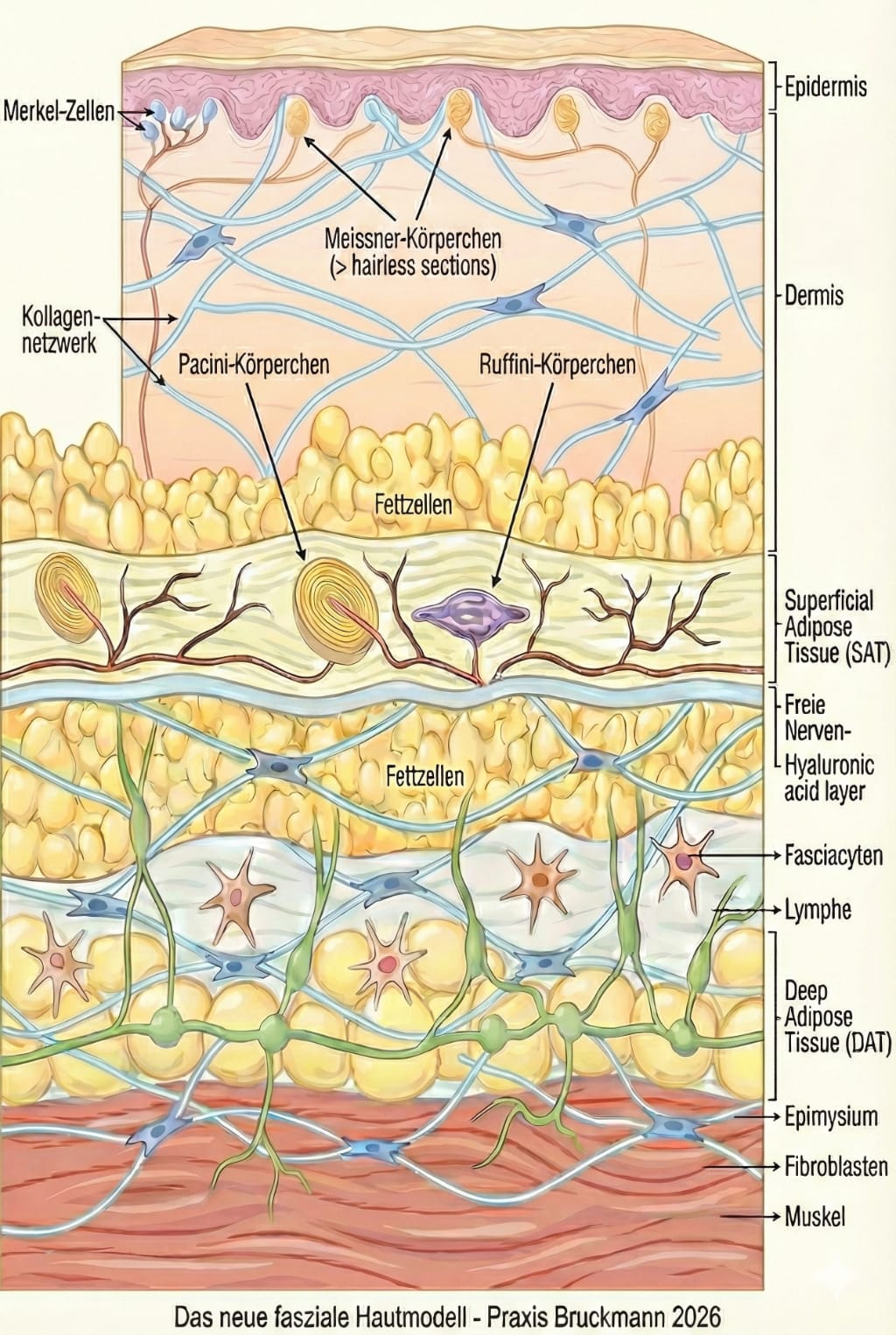 Unter der Haut folgt nicht einfach nur "Fett", sondern ein hochorganisiertes Dämpfungssystem. Das Bild unterscheidet hier präzise – wie es die moderne Forschung (u.a. Lancerotto & Stecco) fordert – zwischen zwei Fettschichten: