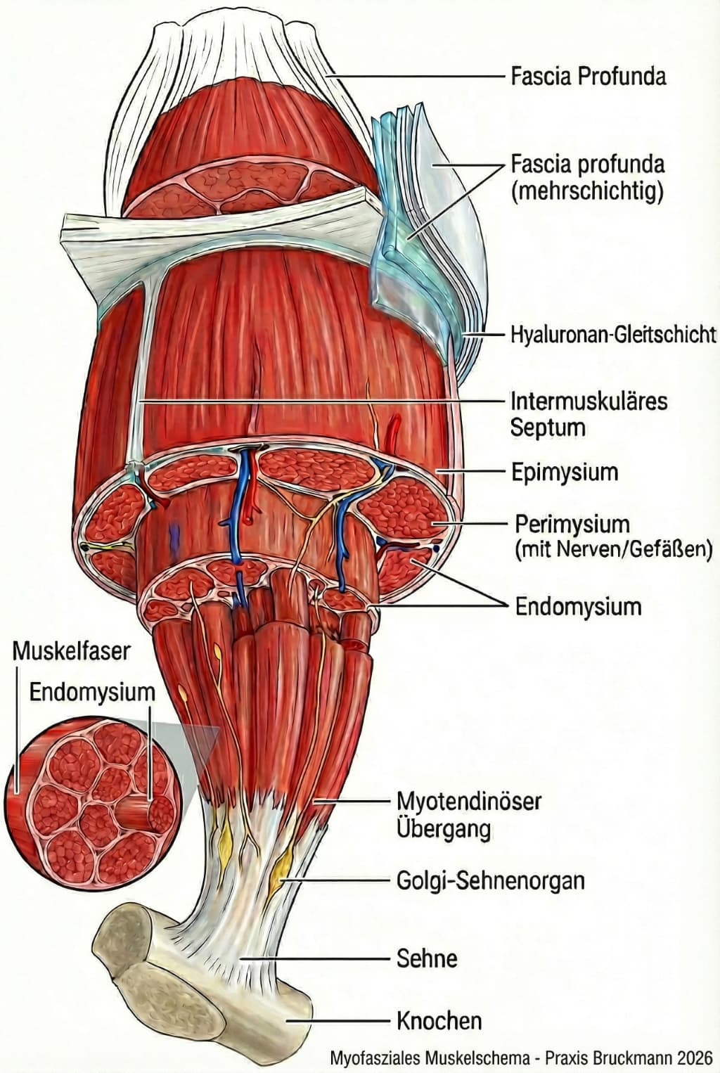 Muskelmodell - myofasziale Aspekte - Praxis Bruckmann (2026)Klassische Lehrbücher zeigen die tiefe Faszie oft als eine simple "Wurstpelle". Die moderne Forschung (Stecco et al. 2011; Stecco 2015), zeigt, dass sie oft mehrschichtig ist. Zwischen diesen dichten Schichten und zwischen der Faszie und dem Muskel (Epimysium) liegt lockeres Bindegewebe, das reich an Hyaluronsäure ist.