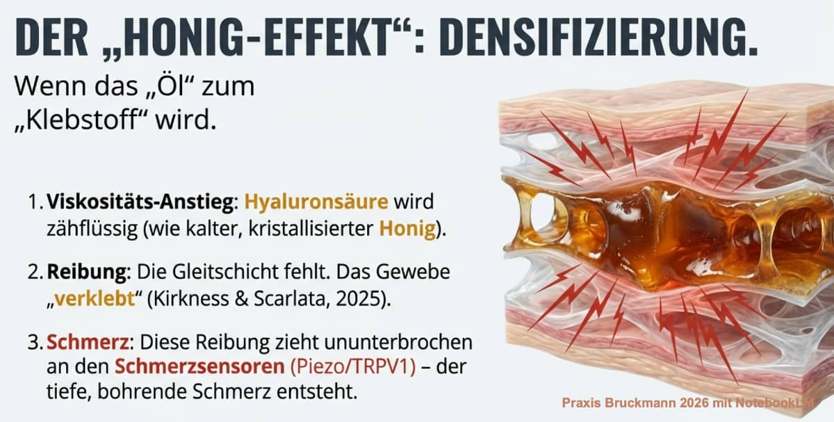 Densifizierung der Faszien - ein Weg in den Schmerz - Praxis Bruckmann 2026emeint ist ein Ruhezustand der Zellen versus ein Remodelling (Kirkness & Scarlata, 2025, Stecco 2025). Die Hyaluronsäure wird zähflüssig und das Gewebe anhaftend - es entsteht eine andere Flüssigkeitsdynamik. Die Wissenschaft nennt diesen Verdichtungsprozess „Densifizierung“ (Kirkness & Scarlata, 2025). Dadurch entsteht bei jeder Bewegung eine mechanische Reibung im Gewebe - ein Honig-Effekt. Wenn Honig warm ist, fließt er flüssig und geschmeidig. Wird er kalt oder steht lange, kristallisiert er und wird zäh und fest. Genau das passiert bei der Densifizierung im Körper. Diese Reibung zieht ununterbrochen an den feinen Schmerzsensoren (Piezo und TRPV1) und löst durchaus tiefen, bohrenden Schmerz aus. Moderne Ultraschallgeräte können diese verminderte Gleitfähigkeit (auch verursacht durch Stress) der Faszien heute sogar in Millimetern objektiv messen und bildlich darstellen (Brandl et al., 2024).