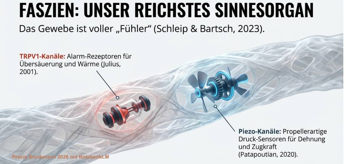 Schmerzforschung mit Nobelpreis und die Auswirkungen auf myofasziale Schmerzen - Praxis Bruckmann 2026Früher dachte man, Faszien seien lediglich passives Verpackungsmaterial für unsere Muskeln und Knochen. Heute definiert die Wissenschaft das fasziale System als ein körperweites, hochkomplexes Netzwerk, das unsere mechanische Spannungsübertragung überhaupt erst ermöglicht (Stecco et al., 2025). Viel wichtiger noch: Faszien gehören zu den am dichtesten mit Nerven durchzogenen Organen unseres Körpers und sind voller winziger "Fühler" (Schleip & Bartsch 2023).
