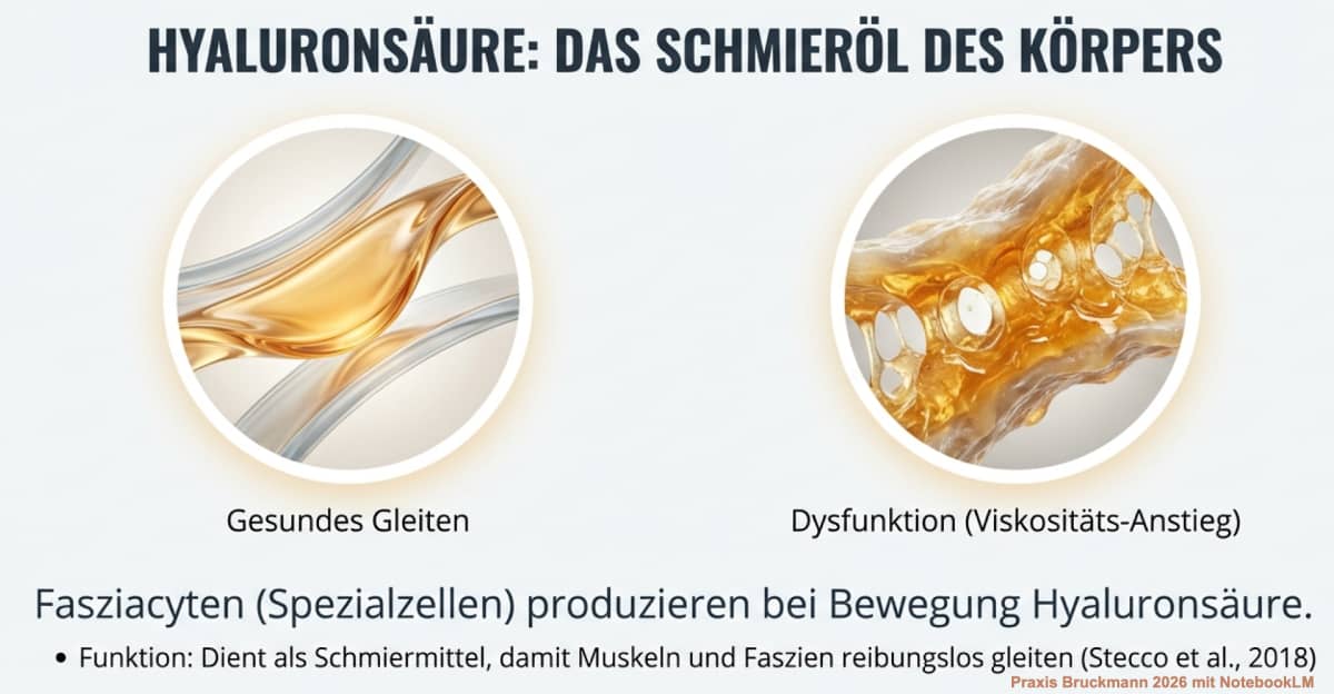 Das Schmieröl für die Motoren: Damit Muskeln und Faszien bei jeder Bewegung reibungslos aneinander gleiten können, produzieren spezialisierte Zellen bei Bewegung im Bindegewebe (die sogenannten Fasziacyten) ununterbrochen Hyaluronsäure – quasi das körpereigene Schmiermittel (Stecco et al., 2018).