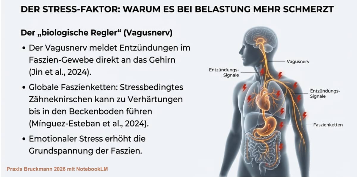 Haben Sie das Gefühl, dass Ihre Schmerzen in stressigen Lebensphasen schlimmer werden? Auch das lässt sich heute belegen (Overmann 2024, Brandl 2024). Unser Körper und unser Gehirn kommunizieren pausenlos miteinander. Forscher haben herausgefunden, dass der Vagusnerv Entzündungen im Faszien-Gewebe direkt an das Gehirn meldet. Dort sitzt eine Art „biologischer Regler“, der die Entzündungsreaktionen im Körper aktiv hoch- oder herunterfahren kann (Jin et al., 2024). Zudem überträgt sich emotionaler Stress auf die Grundspannung der Faszien: Stressbedingtes Zähneknirschen kann über sogenannte "globale Faszienketten" sogar messbar zu schmerzhaften Verhärtungen im weit entfernten Beckenboden führen (Mínguez-Esteban et al., 2024). Das ist Grundlagenforschung und wird noch weiter zu klären sein.